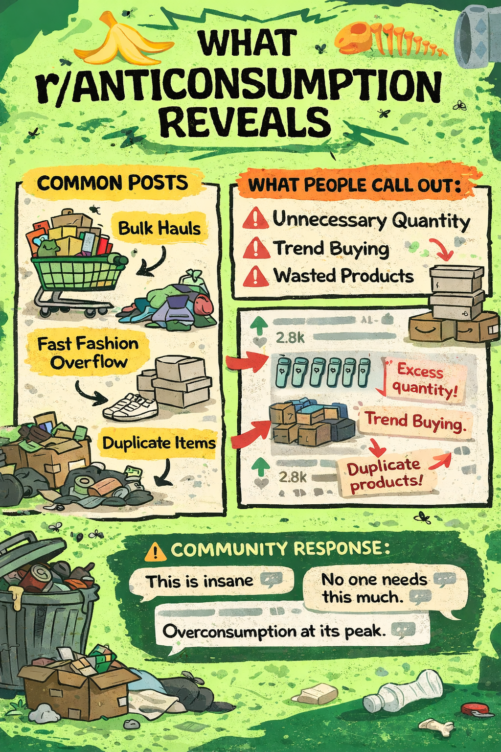 A good amount of posts on this subreddit focus on exposing everyday examples of excessive or unnecessary consumption. With most covering wasteful product use or how to refurbish something so it will last you longer. The community encourages users to rethink these bad habits of consumption. But will also roast those who don't agree with what anticonsumption stands for.