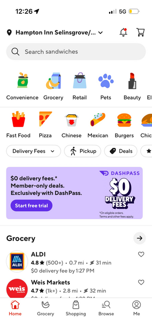 The app design of DoorDash is very colorful and intuitive. They make it really easy to see what options are available around you. The immediate visual cues of all the different types of cuisine is a nice touch that incentivizes people's cravings. All of the buttons are nice and simple, but easy to understand. The menu's on the top and bottom are also simple but functional. The bottom menu bar has all of the main pages you would want to be in. With the homepage having a nice wide search bar at the top of the screen, which is a universal placement. There is also a dark mode for people that like a darker background when it comes to their apps.